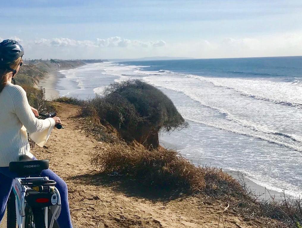 We flew with a few easy pedals careening through quiet seaside neighborhoods admiring homes decorated for Christmas, hopping off at various beach stops and the Self-Realization Fellowship Encinitas Shrine. The free lake shrine meditation garden and temple hang off the ocean cliff with spectacular views of the Pacific Ocean til the end of the world. After zooming back up the coast around 20 mph pedaling like you would on a regular bike with the winds whipping against us, we marveled at the massive stretches of pristine coastline and didn’t have to worry about getting tired or climbing hills or even running out of a charge since the Pedego Electric Bikes use a rechargeable lithium-ion battery that lasts all day.