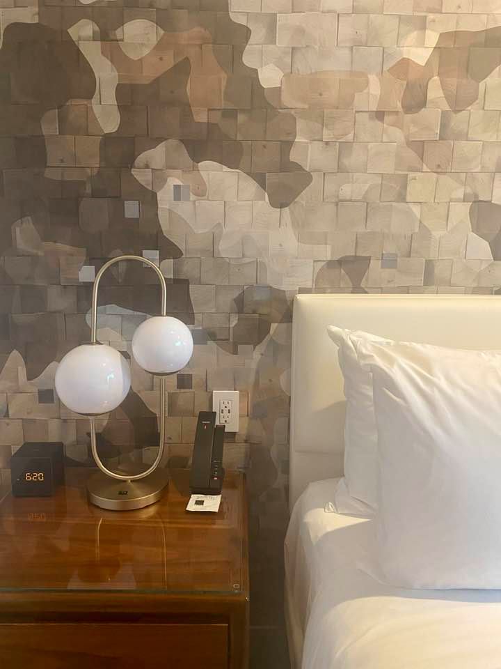 The bathroom design is also beautifully done with a circular sink with rounded walnut wood, funky tile stall design, and round mirrored lighting. The brand’s signature scent is a nice touch developed by MALIN+GOETZ with scents of sage, peppermint, and cilantro.