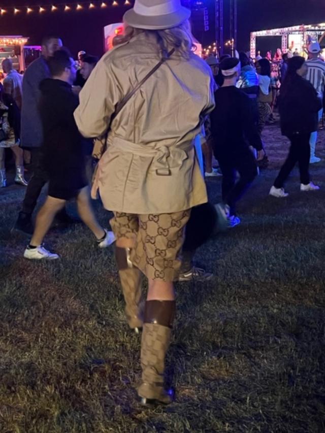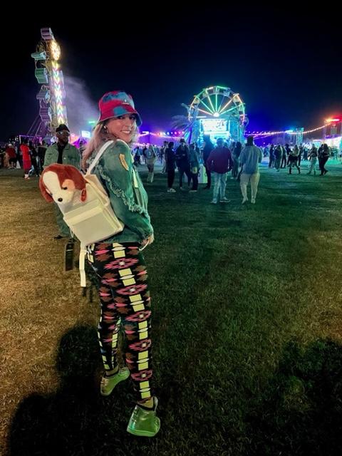 Fishnet full-piece with fanny packBikini CowgirlMetallic, a barrett, eyeglasses with chains, killer kicks/boots, and a purse like a coke? Strings and more strings Gucci croc hunter70s inspirationBritish rocker?Fringe and ripped tights?Sparkles and more cowboy hats More cowboy hats and boots because it is the desert!Carnival toys as the new accessory – riding the pink unicorn after WINNING!NEON colors of course! Zoey Deutch attends Levi’s And Tequila Don Julio Neon Carnival, with Hydration By Liquid I.V. on April 16, 2022 in Thermal, California. (Photo by Cassidy Sparrow/Getty Images for Neon Carnival)More Neon