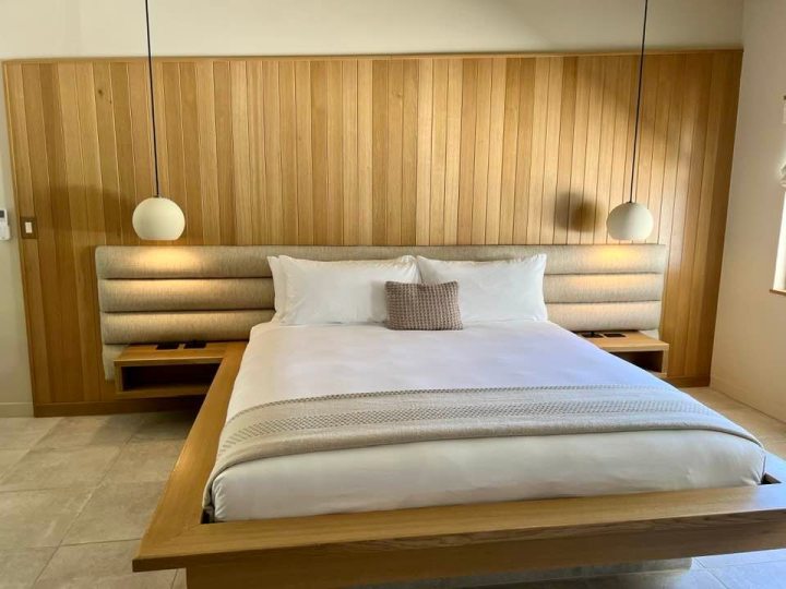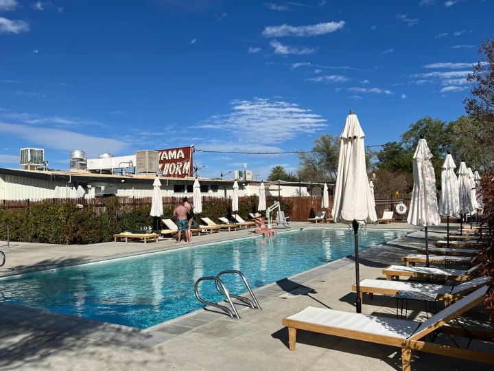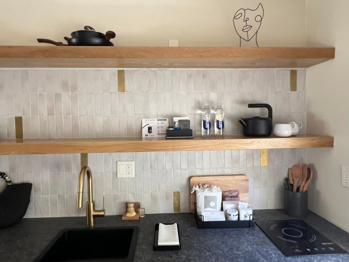 Most rooms are set around a grassy courtyard with olive trees and a lengthy fire pit perfect for desert nights under the stars. Choose from suites (some 620 square feet), junior suites, and studio rooms with stone tile flooring, walk-in mosaic tile showers, and uber-comfy mattresses set in floating platform beds in a minimalist wood frame with the same white oak slats accenting the headboard. Clean lines with pops of chic black are felt throughout the art, furniture, and architecture. For those who may not want to spend all their time eating out, almost all rooms come with impressive kitchenettes with floating shelves, a cooktop with cookware and kettle, pottery-style dishware, and fancy coffee and tea. Patios with hammocks are an option at the back of most rooms for those who want more privacy.