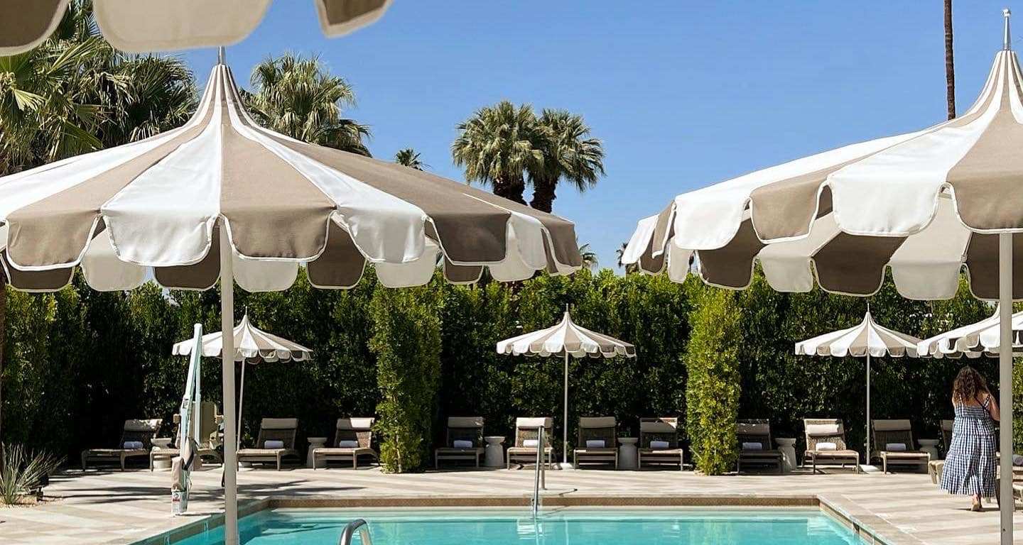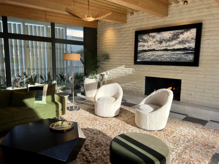 The front entrance’s lengthy white slats pay an architectural nod to the popular breeze block walls seen throughout Palm Springs, creating privacy and light shadow drama. Original palm trees poke near the entrance interior surrounded by lush local plants such as agaves, banana trees, birds of paradise, jasmine, trailing rosemary, and more. Upon entering the 800 square foot lobby, it feels more like stepping into a lavish living room in someone’s home but keeping with Palm Springs vibes, one wall is fully open to soak in the mountainous palm tree landscape. Look up and the ceiling is expertly crafted with light wood slats and mirrors and dreamy rich gold vintage lighting. Stay for the sunset hues over cocktails as this check-in area is also a cocktail bar where guests can lounge on the plush deep green couch facing a cozy fireplace. In the morning, pop in this lobby lounge living room for complimentary coffee and breakfast bites.
