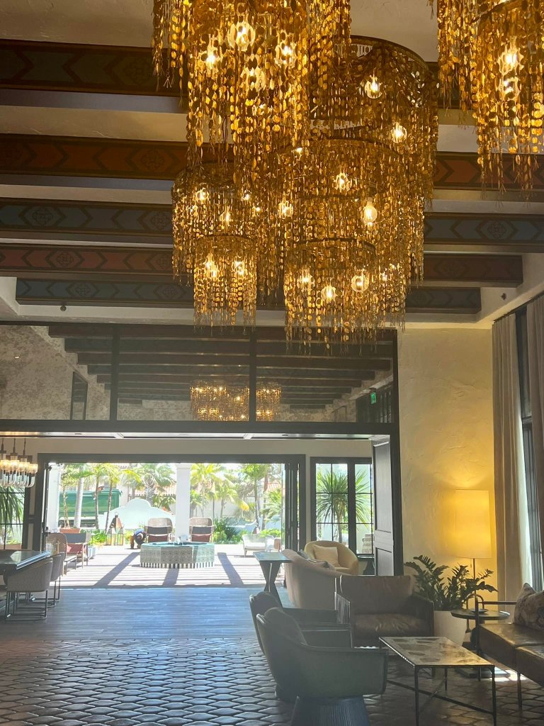 The lobby oozes charm with a glamorous fireplace featuring original pearly-esque tiles and a check-in area with terra cotta floorings, spectacular dazzling gold dripping chandeliers hanging from arches and exposed beam ceilings, and a large-scale ceramic tile art installation behind the reception desk. The lobby leads to a refined library foyer workspace and an open-air patio where the golden California sunlight and ocean air assaults the senses. Choose from various seating areas in the courtyard with a Spanish/Moroccon-style tiled fountain as a focal point.