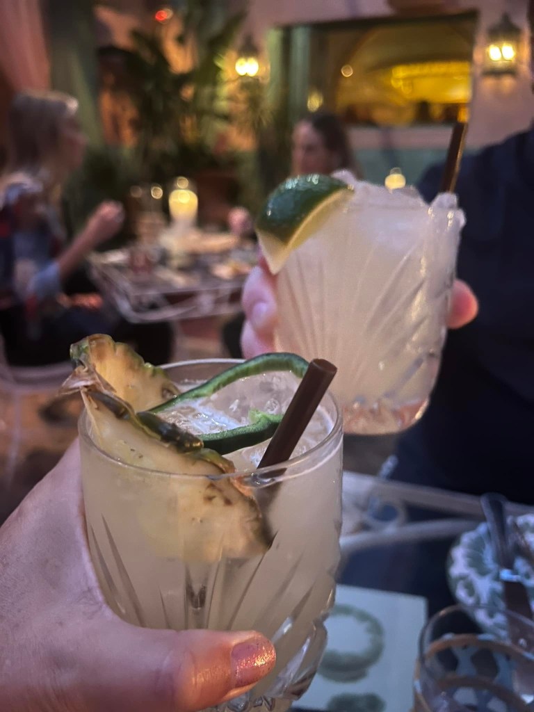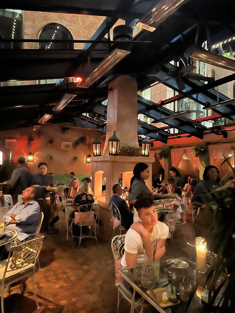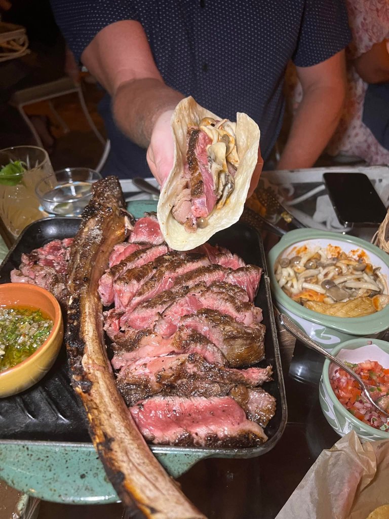 While we overheard actors discussing their career moves, Ryan Phillippe was behind us dining with his boys and Ricky Gervais or his lookalike appeared in our tomahawk steak video. The tables surrounding us were filled with uber gorgeous women sharing tantalizing generous farmer’s market fresh salads and sliced filet mignon, couples cheers-ing over romantic dates with Moscow Mules in ceramic mule mugs nonetheless, and what looked like a graduation or birthday celebration where a teen opened a new skateboard. The whole vibe was rustic gorgeous and less pretentious than most 90210 restaurants. This post-pandemic world seems to be moving towards this sense of easiness – where a rustic tile patio with salmon curtained cabanas is centered by a central open stucco fireplace, tropical foliage, and wrought iron tables and chairs with cute colorful pillows. Add in custom-made Televara stoneware pieces and Mexican ceramic plate ware and it just feels right. Doesn’t everyone want to be transported to Baja, so close to LA?