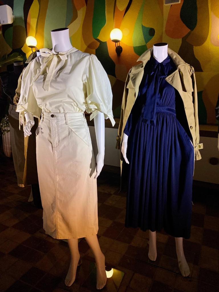 The ELLE dress styled with the COCO TRENCH COAT was everyone’s favorite. It is made of luxe gabardine twill in a classic camel color. The REESE BLOUSE is organic cotton with “the ALB signature bow tie” details. The REESE was tucked in The PATHAWAY SKIRT, a fabulous A-Line high-waisted, ecru denim skirt while the PATHAWAY WIDE LEG are jeans crafted in the same stretch ecru denim.