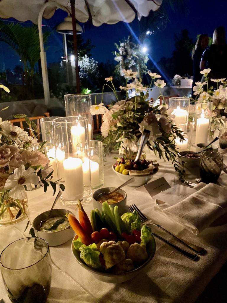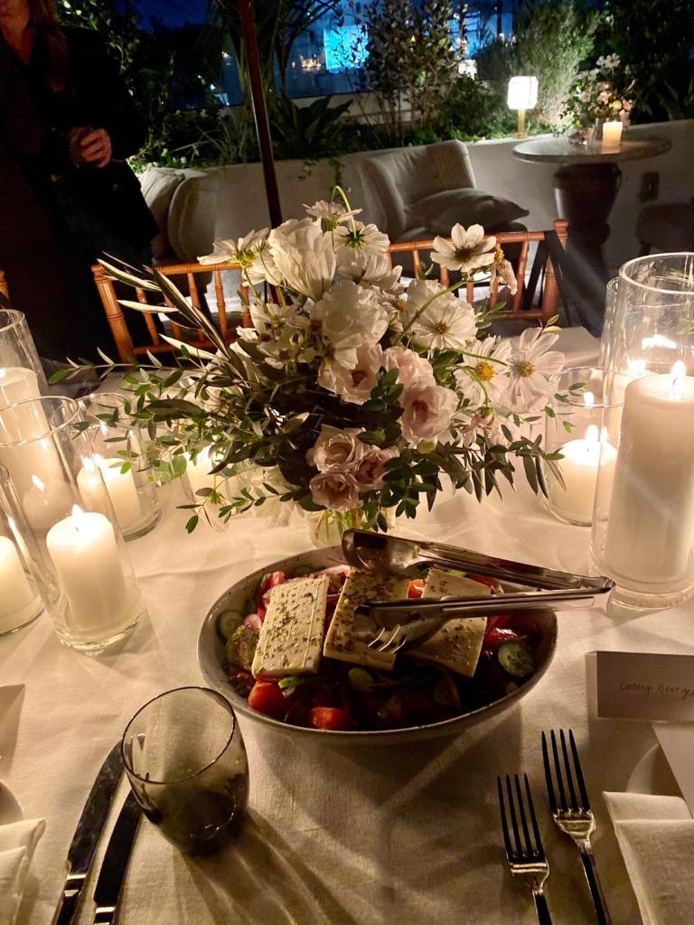 The lavish table décor set the celebratory mood filled with floral arrangements and cream candles that sparkled in glass jars, plus an array of colorful veggie starters. The dinner was a delicious blend of Greek/Mediterranean dishes with a California touch.