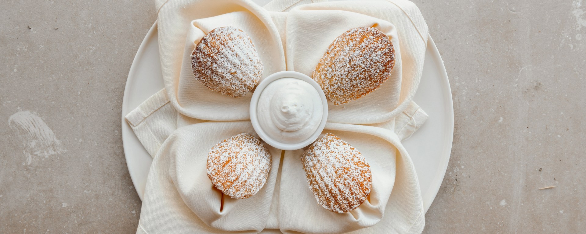 Dessert options include the requisite Assiette de Fromage, a selection of cheeses; Madeleines au Beurre Noisette, soft, warm brown butter madeleines and salted honey chantilly; and Gâteau au Fromage, a delicate creme fraiche cheesecake with passion fruit gelee.