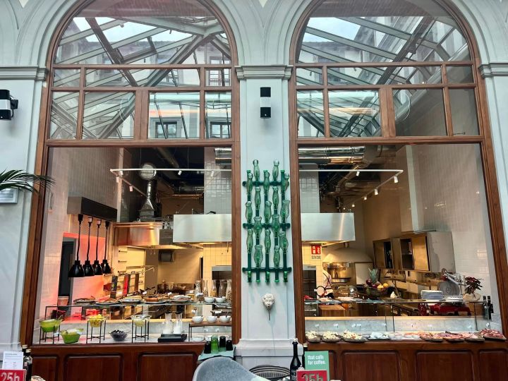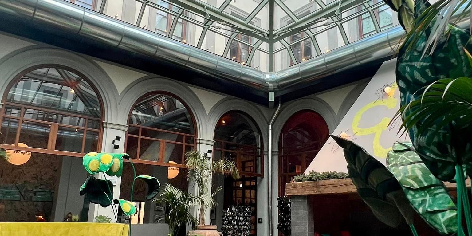 Don’t let the name fool you. I, too, assumed this might be a basic hotel, but 25Hours Hotel Piazza San Paolino is full of surprises. Inside the lobby, it’s hard to know where to look and easy to be pulled from one amusing piece of décor to the next. Shiny mint-colored suitcases stacked every which way surround the check-in area and expose curious oddities and gifts for sale. Immediately, I was struck by the vaulted glass ceiling that anchors the historic Palazzo lobby as light streamed in above the San Paolino Restaurant social hub. Tall potted foliage made the area feel like a garden, and when I looked closely, some interweaving plants were fake with big yellow spots like they were created for Alice in Wonderland. Faux spiders crawled up the fireplace, reminding me of Gaudi’s architecture in Spain.