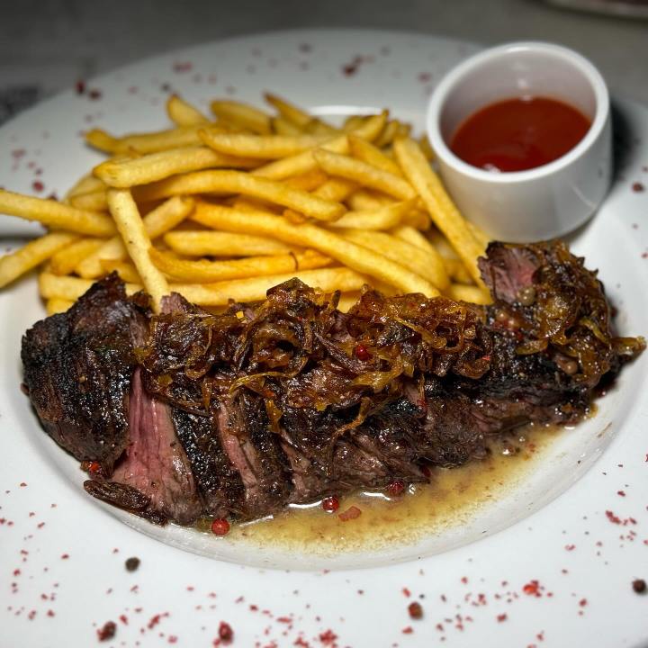 Indulge in perfectly cooked meat – 100% grass-fed Wagyu Burger with fries and Hanger Steak Frites with peppercorn brandy butter.