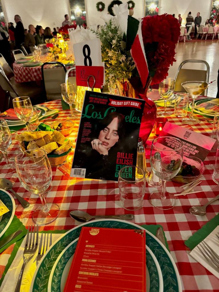 The tables at the Garibaldina Society were adorned in traditional Italian style, featuring red and white checkerboard tablecloths while a bocce ball court was behind one bar – all enhancing the ambiance. Beloved singer Billie Eilish was also celebrated as the newest LA Magazine decorated the tables, with Eilish on the cover. An Italian songstress added to the evening’s charm, whose melodies kept the dance floor lively throughout the night. We spotted our favorite rockstar Perry Farrell from Jane’s Addiction at the table next to us and clinked one too many Negronis with friends in attendance.