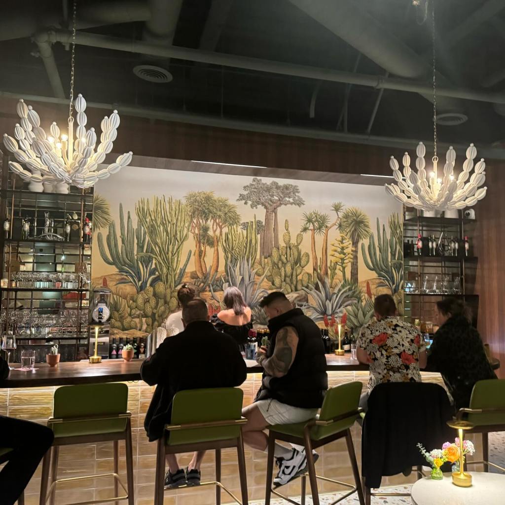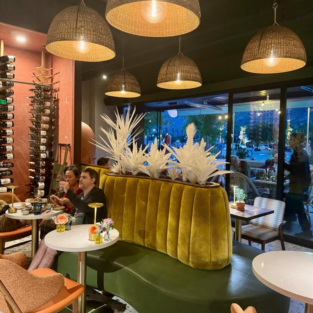 Stepping into Canopy Wine Lounge is like arriving at someone’s carefully curated Palm Springs home, with rich fabrics in various hues, walnut paneling, terrazzo patterned tile floors, custom banquette seating, and a frame wall with Samsung TV hiding as art. The bar is accented with an illuminated wall-size mural of a desert garden anchored by white chandeliers shaped like cacti. Your eyes are drawn to white poking canvas palm fronds and a floor-to-ceiling glass wine fridge. The design god of the desert, Christopher Kennedy, is responsible for this carefully curated aesthetic and for making all the parts seamlessly work together.