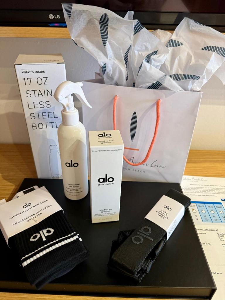 Alo Yoga spoils participants with several great products left for guests in the hotel room to complete the wellness experience, such as soft stretchy Alo yoga clothes, Alo fitness gear (like yoga straps and yoga mat cleaner), and Alo beauty products.