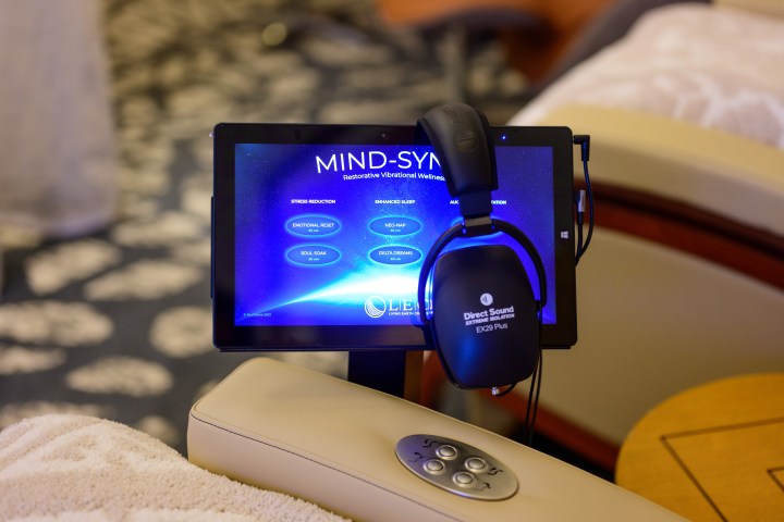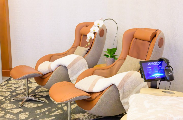 We were invited in to try out the specialty loungers with tech-savvy tools. The Mind-Sync Loungers help with enhanced sleep, stress reduction, and augmented meditation. In 20-minute or more intervals, guests tune into the restorative vibrational wellness headphones with vibroacoustic sound wave therapy and a cozy Kashwere blanket with their feet up to find tranquility and “transcend.” The tunes and waves feel hypnotic and the machine offers many different options to choose from to decompress. Carefully curated music synchronizes the brain’s left and right hemispheres, gently lowering brain activity to the calmer Alpha, Theta, and Delta states.
