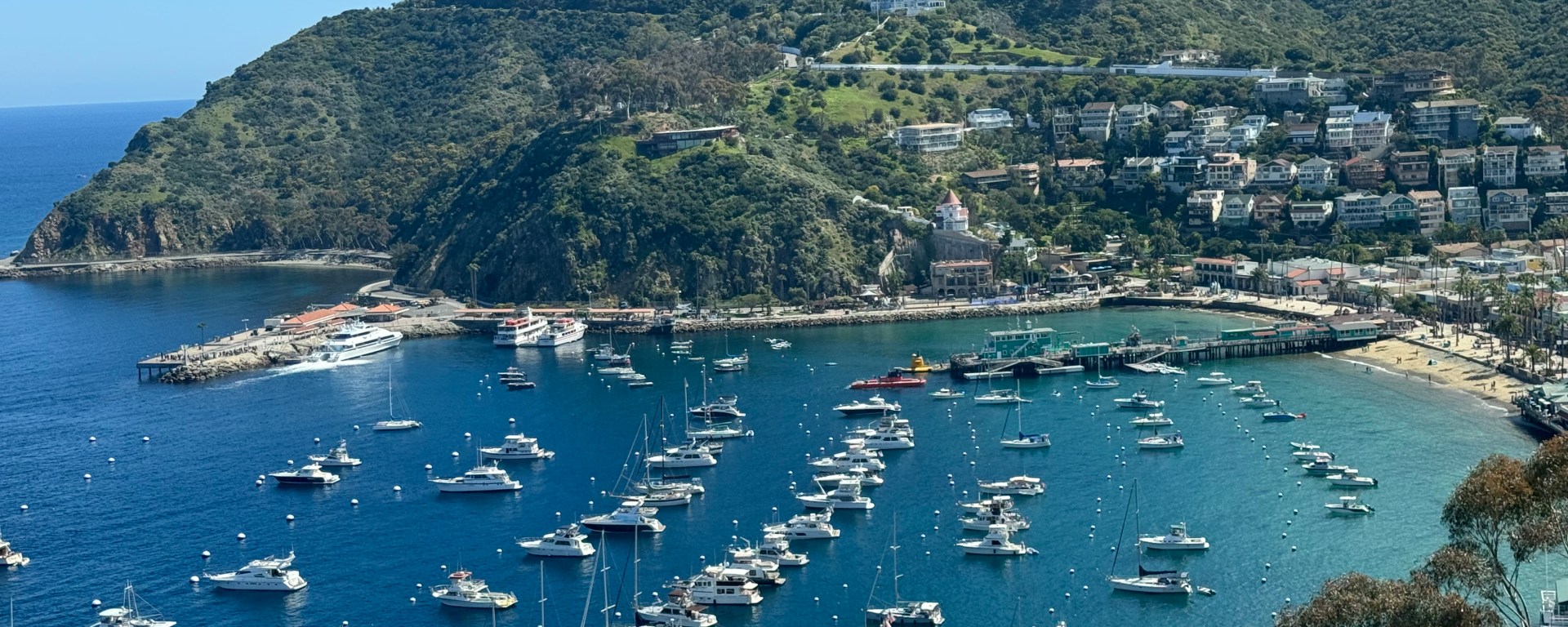 Flashbacks of Italy came to mind as we spiraled up and around switchback turns from the harbor town of Avalon. The cliff-hugging ocean vista views were certainly worth these fearful moments, expressing “OMG” aloud as we whizzed above the aquamarine crystal-clear waters below, where white boats accented the dazzling blue hues and homes hung off the curved hugging hillsides. Just 26 miles off the California coast, Catalina Island feels worlds away from mainland Los Angeles.