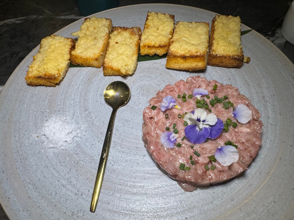 A5 Wagyu Tartar is adorned with flowers and accompanied by slices of truffle cheese toast that enhance each bite of rich umami meat with the crisp cheesy crunch.