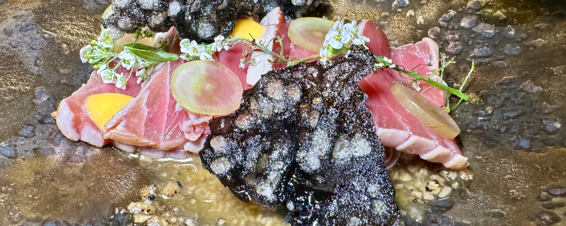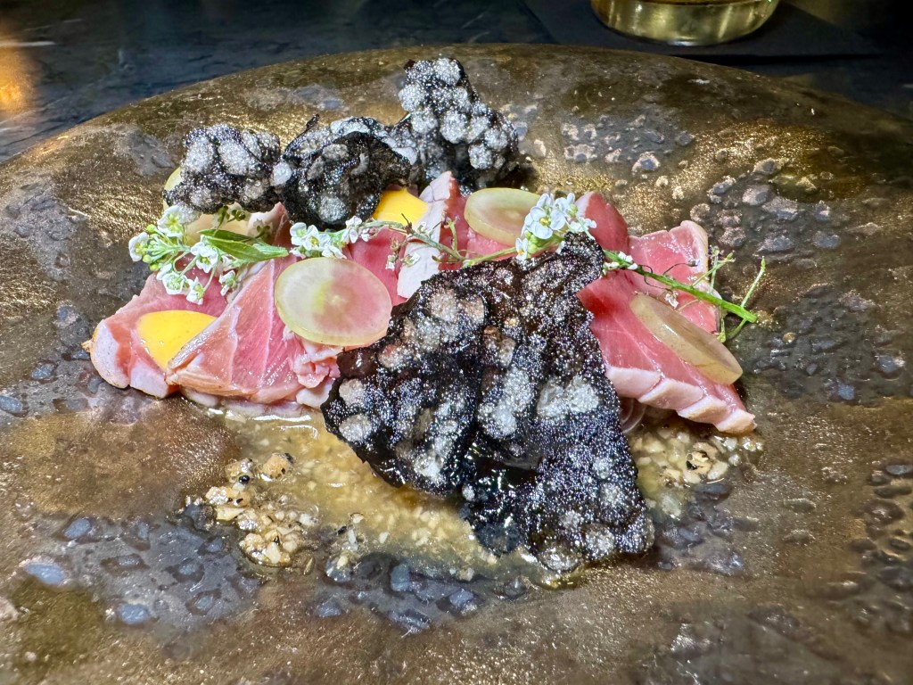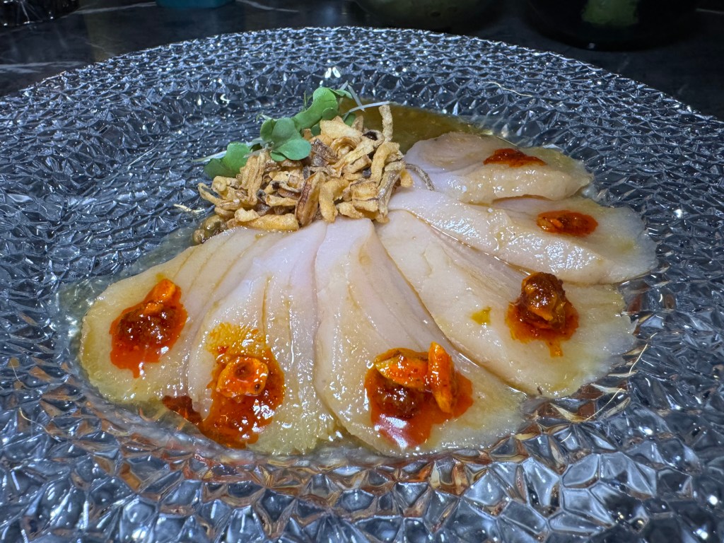 Albacore – fanned out with truffle oil, chili crisp, fried onions – delivers a burst of spicy flavor with a crunch.