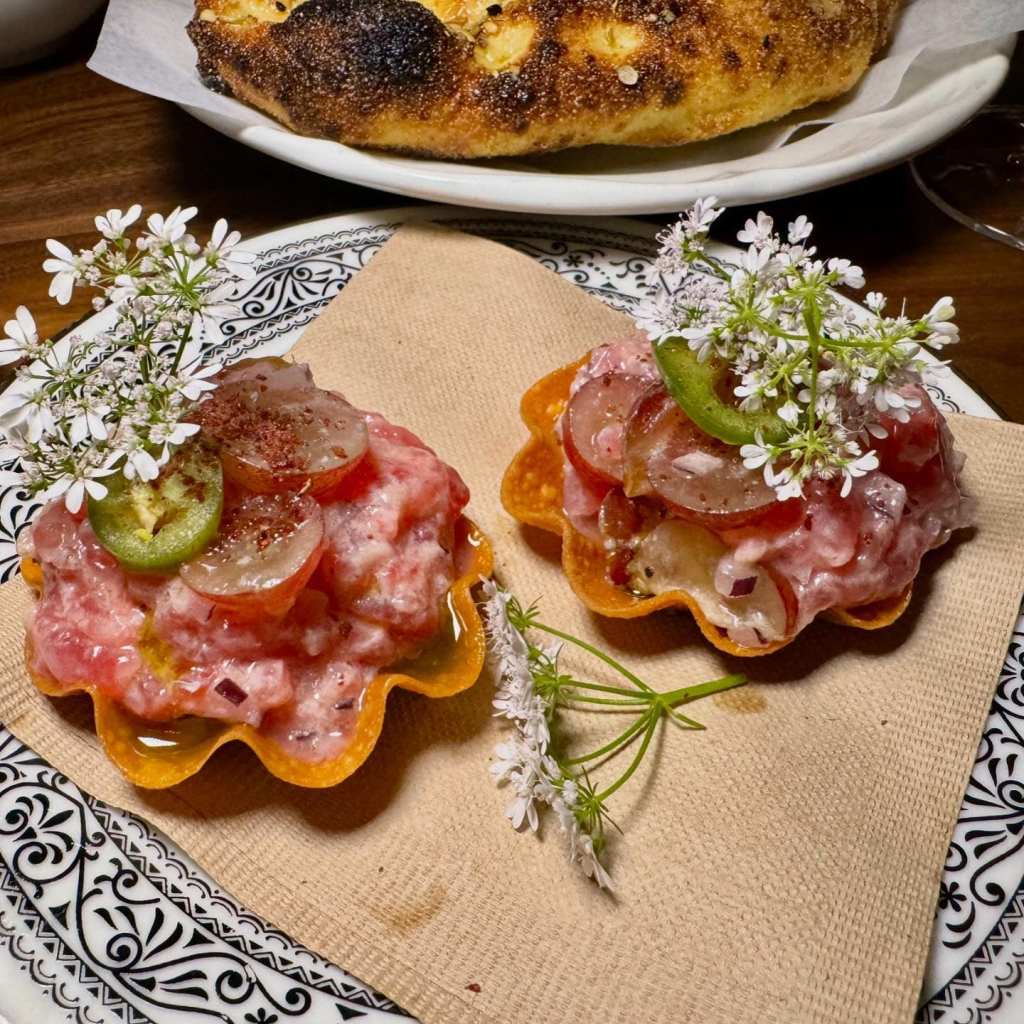 The Carmel menu works well for sharing numerous dishes, at least four to five. Share the elegant cupped Tuna Tartar bites doused with flowers and grapes or MY GRANDMA’S MUSHROOMS CIGAR stuffed with baharat (Middle Eastern spices), pine nuts and chuma pepper. Break it into pieces and dip! SMOKED EGGPLANT MASABAHA, KAMPACHI CRUDO, and the BONFIRE JAPANESE SWEET POTATOES with labneh came highly rated from our nearby seated neighbors as tables are super close.