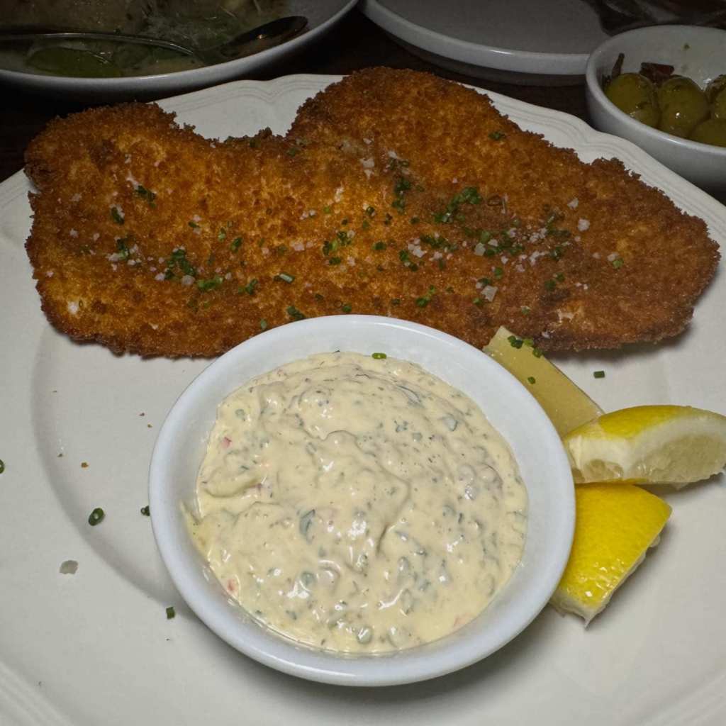 The HANGER STEAK KEBAB is slid off the skewer at our table onto a hefty pita bread accompanied with fresh lafa, meshwaya, sumac onion, and herbs. I devour it quickly but after the first course of bread, we concentrate more on the meat. A nice companion to the meat is the RED SNAPPER SCHNITZEL reminding me of pounded pork schnitzel in Austria. This flat breaded version is delicious with the tartar like sauce.
