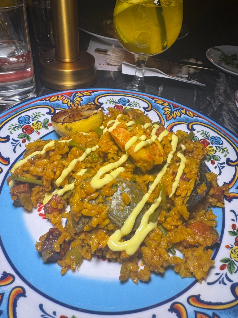 After the introductory courses, step outside to admire the grand Paella pan – as wide as a table – being stirred by the chef, with loads of seafood and veggies mixed within the saffron flavored rice. A crema is doused on top of the Paella for the filling grand finale. Indulge, but save room for the shared the light creamy Basque cheesecake, burnt on top for a rich creme caramel flavor.