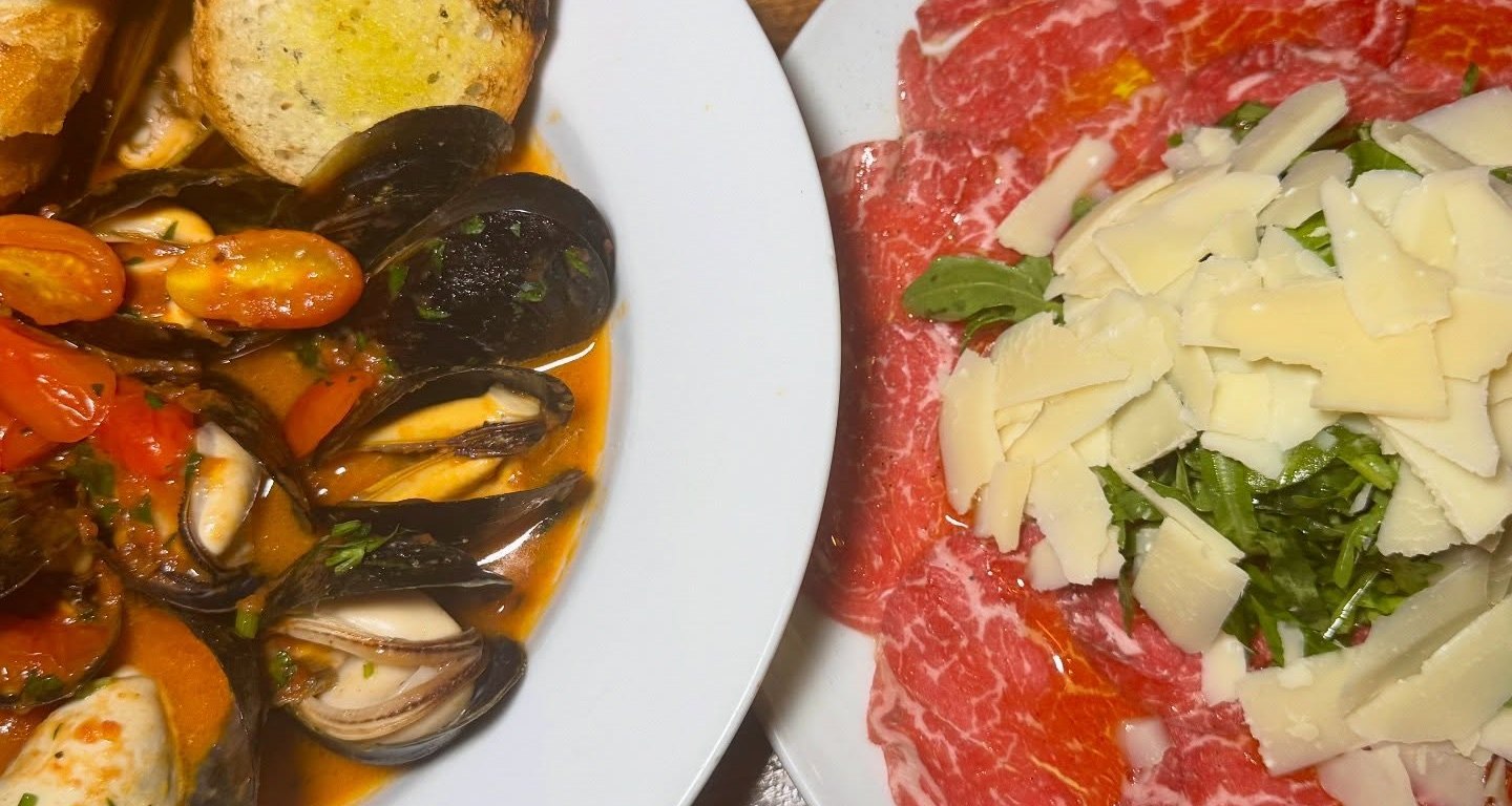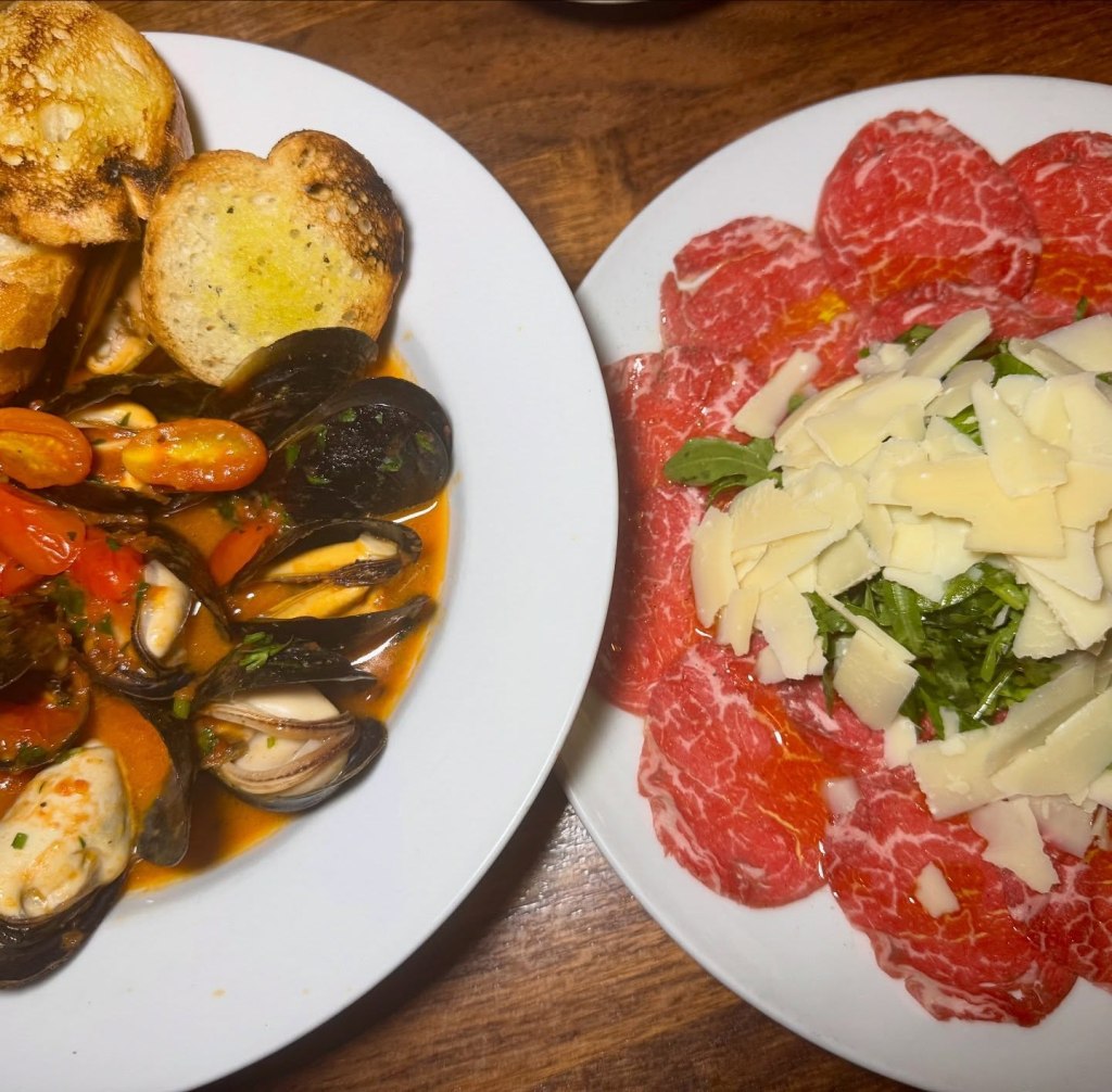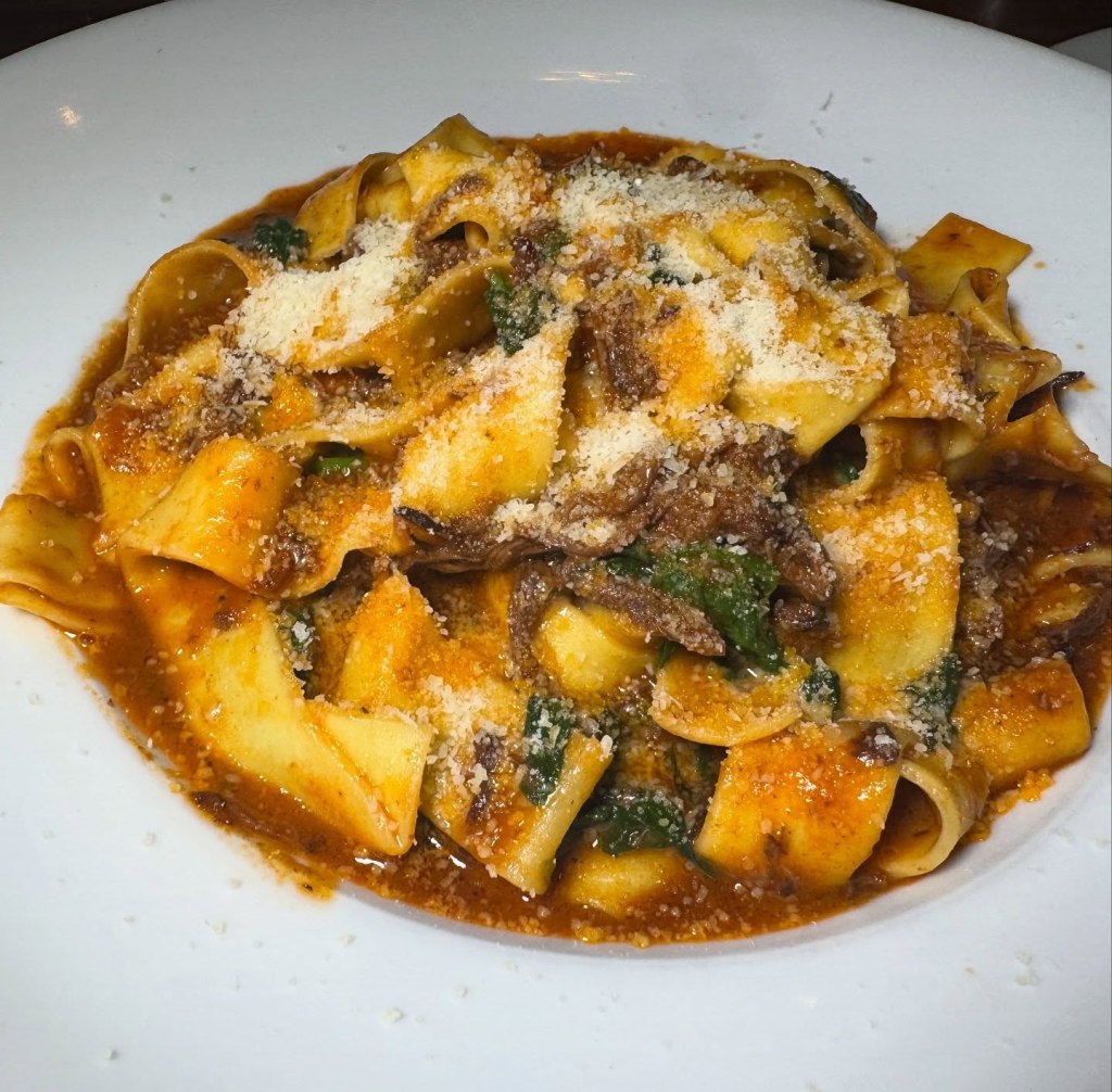 Share more courses – like the juicy plump mussels in a red broth, Calamari Fritti, and several sensational homemade pastas like Linguine with Braised Short Rib (Brevi Costole) with a rich sauce, Lasagne, Linguine Pescatore, or Luganica, a papparedelle pasta with homemade sausage, mushroom, and arugula in a creamy tomato sauce. Complement your meal with grilled veggies with burrata. Come on a Monday and score pasta specials for $16.