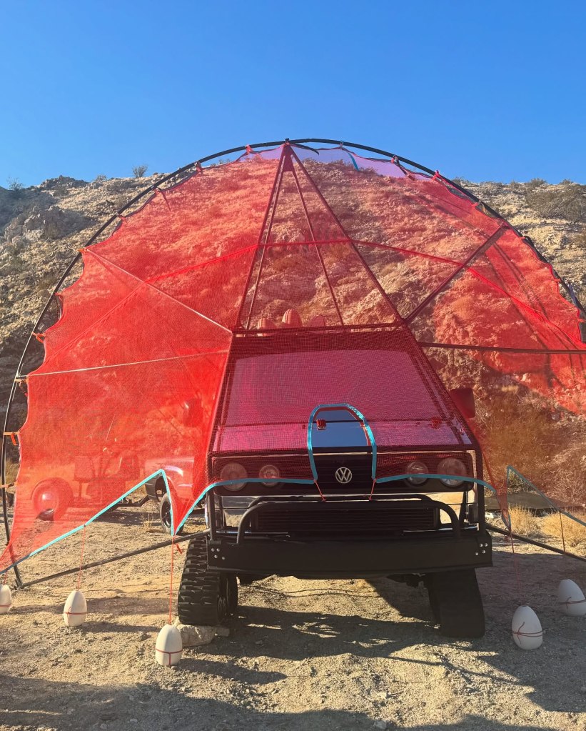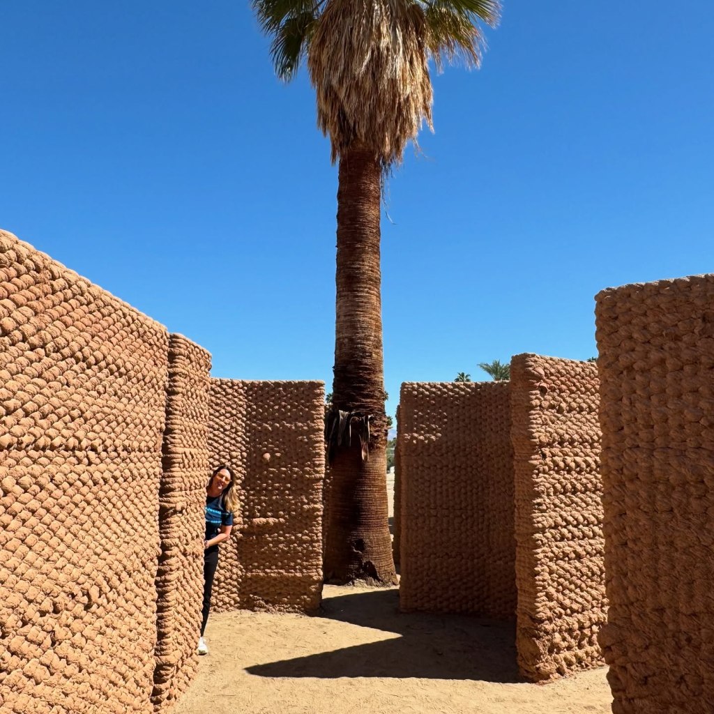 We met Swiss artist Raphael Hefti, who enlightened us on his artistic process and the overwhelming positive and kind responses he received when asking for volunteers to help install. His ‘streaming ribbon’ cuts across the landscape, often looking like a horizon line or shooting beams, depending on which way you approach. What is your perspective? Find his work in Palm Desert.