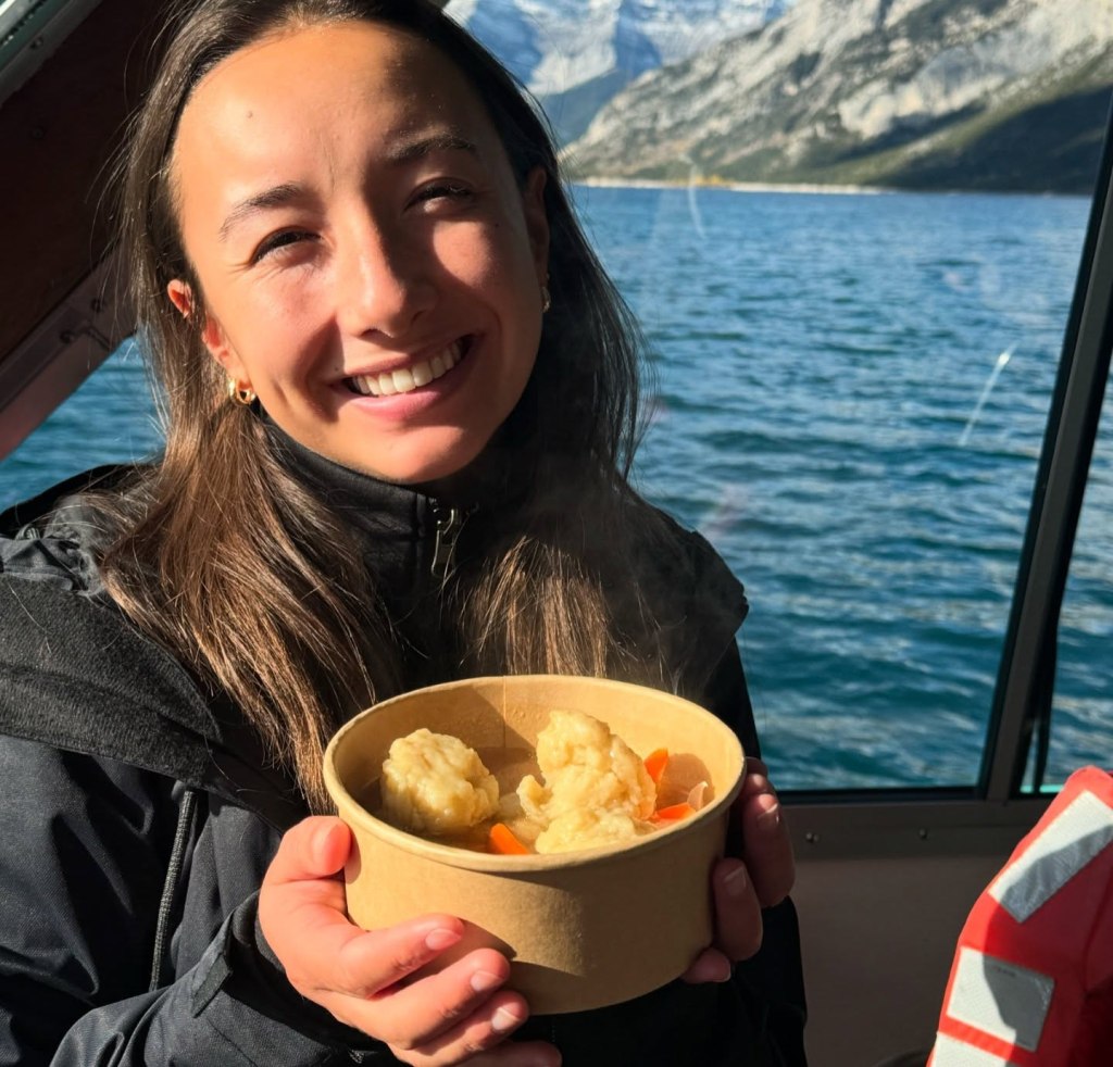 Due to the east-to-west facing valley, this “spirited waters” lake can get swells of 5-7 feet. Why not savor the serene lake and mountain setting on glacial Lake Minnewanka, just a ten-minute drive from Banff on a calm day? In the fresh mountain air on a covered boat, sail across the emerald waters on a “beer voyage” where you’ll learn about four brews and their connection to the Rocky Mountains. Also, a 90-minute guided classic cruise dives into Minnewanka’s fascinating history with possible wildlife sightings and local pine tea. Book a private tour with a chef aboard who creates hearty bowls of chicken noodle soup with luscious dumplings.