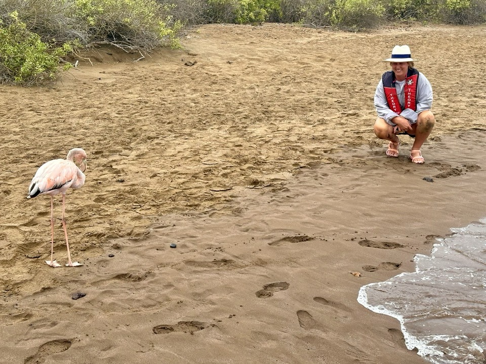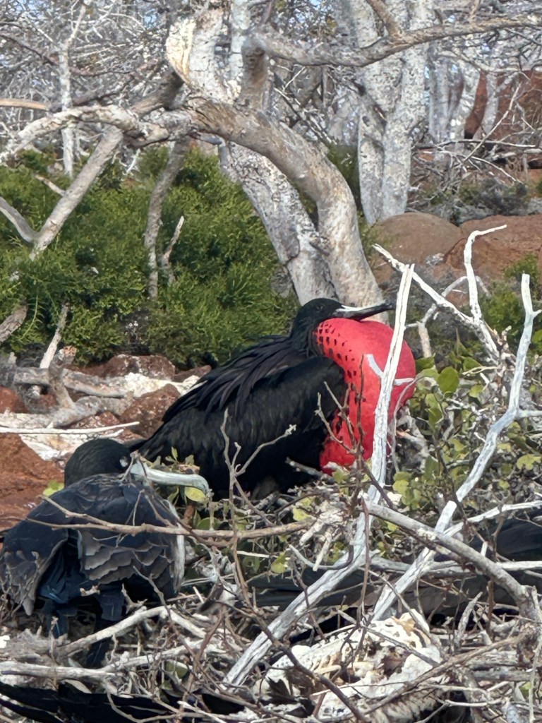 If this wasn’t enough animal adventure, earlier in the day we watched whales surface in the distance, a turtle make a beach landing, and seals play with a puffer fish like it was a ball. We observed pink and black flamingos standing majestically on an island lagoon as they preened themselves then witnessed two juvenile flamingos prance along the beach while prehistoric-looking marine iguanas sat still like rocks and blue footed boobies and frigates squawked around us. Each island presented many delights – albatross performing their mating rituals and launching themselves off cliffsides, red footed boobies nesting, blue footed boobies keeping an egg warm, and giant Galapagos land tortoises munching on guava fruit.