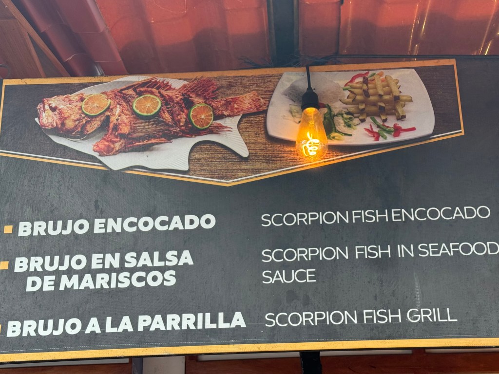 Strange-looking reddish-orange fish with bulging eyes and black dots are on display outside restaurants and in fisherman’s buckets on the streets of Galapagos port towns. Although scorpion fish have poisonous spines, it doesn’t affect their popularity or sweet taste. On our cruise, scorpion fish arrived as an Amuse Bouche spoonful with a tiny fried pickle and what looked like pepita seeds.