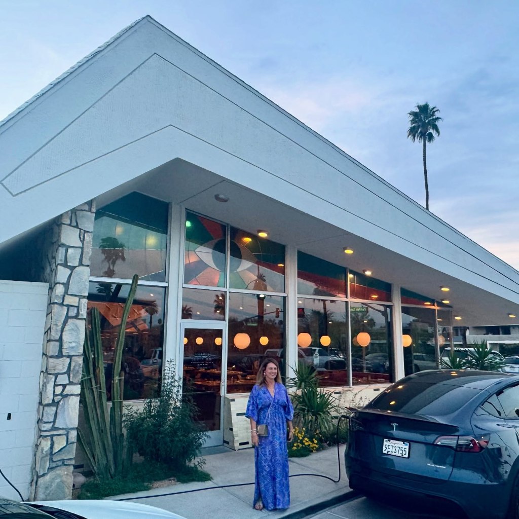 The space itself is a sleek design-forward desert retreat featuring earthy tones of terracotta, sage and sand, complemented by rich wood accents and rattan textures. It’s hard not to ogle the artwork by local artist Lynda Keeler on the wooden walls interpreting a Palm Springs road map as her oil paintings in vintage frames capture vivid colors and radiant illuminations across the Coachella Valley. Thoughtfully arranged seating accommodates intimate gatherings and lively celebrations alike, creating an atmosphere that feels both modern and timeless.