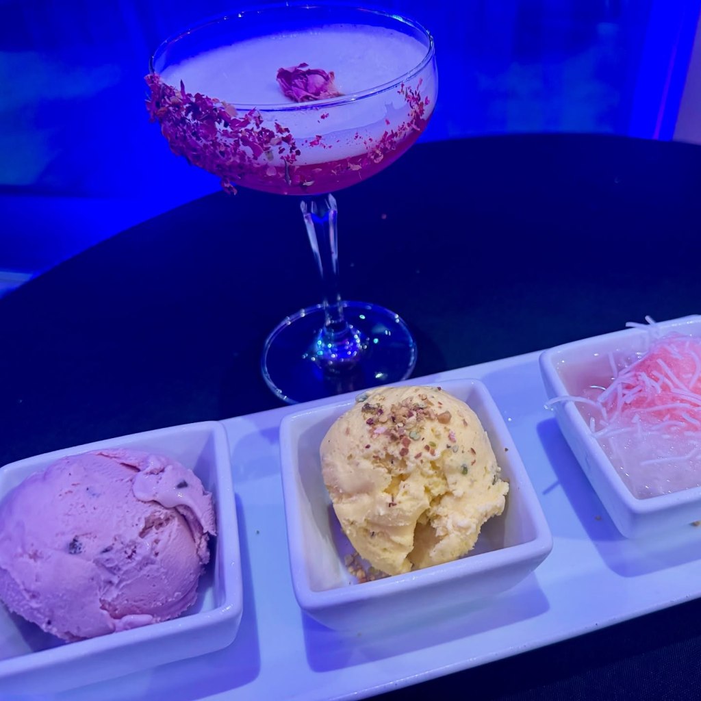 The flavors and textures continue to delight and excite with dessert, as a trio not to miss includes creamy saffron ice cream with pistachio, pomegranate ice cream with baby chocolate chips, and rice noodle frozen in rose water topped with lemon juice and sour cherry juice. Consider an after-dinner cocktail to sip and savor like The Bar Rose with a glass doused in rose petals concocted with Van Gogh pomegranate vodka, gin, rose water, pomegranate juice, and lime juice.