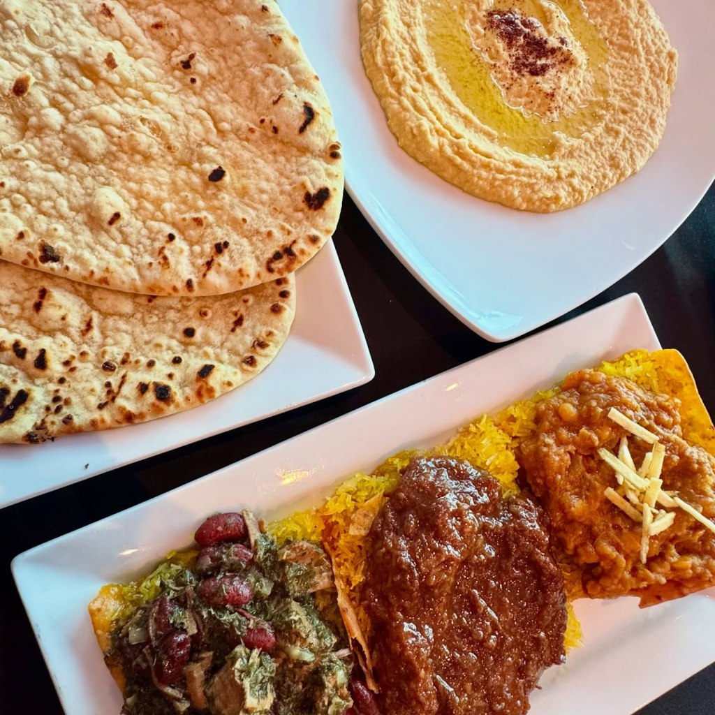 The Mezze section features shareable dishes like Hummus, Domas, and Kashke Bademian. Expand your horizons with the Filet Kebob or Chef’s Favorite, the Zereshk Polo, a Barberry saffron rice served with saffron roasted chicken, so tender the butter-soaked meat falls off the bone. For a unique twist, try their Persian Tacos served on pita on certain nights.
