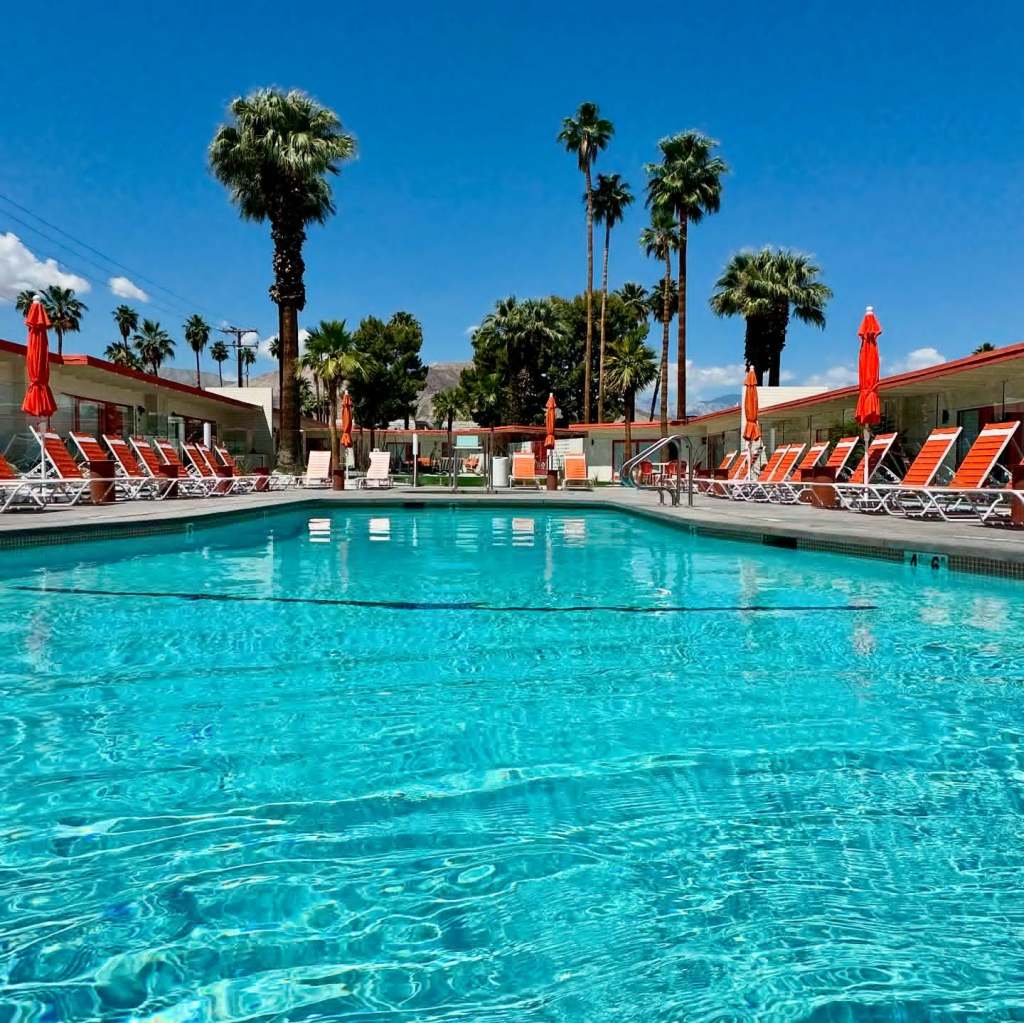 Are you a local needing a staycation? Are you visiting from out of town? Mojave Resort is the first midcentury modern boutique motel to open in Palm Desert, just steps away from El Paseo, the ultimate shopping and dining destination district. This retro adults-only newly renovated hideaway, tastefully accented in orange, has 25 guest rooms situated around a pool with beautiful desert plants, serene courtyard with firepit, and curvy grassy foliage.