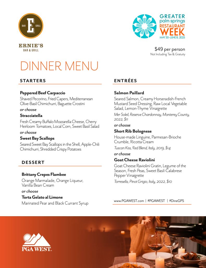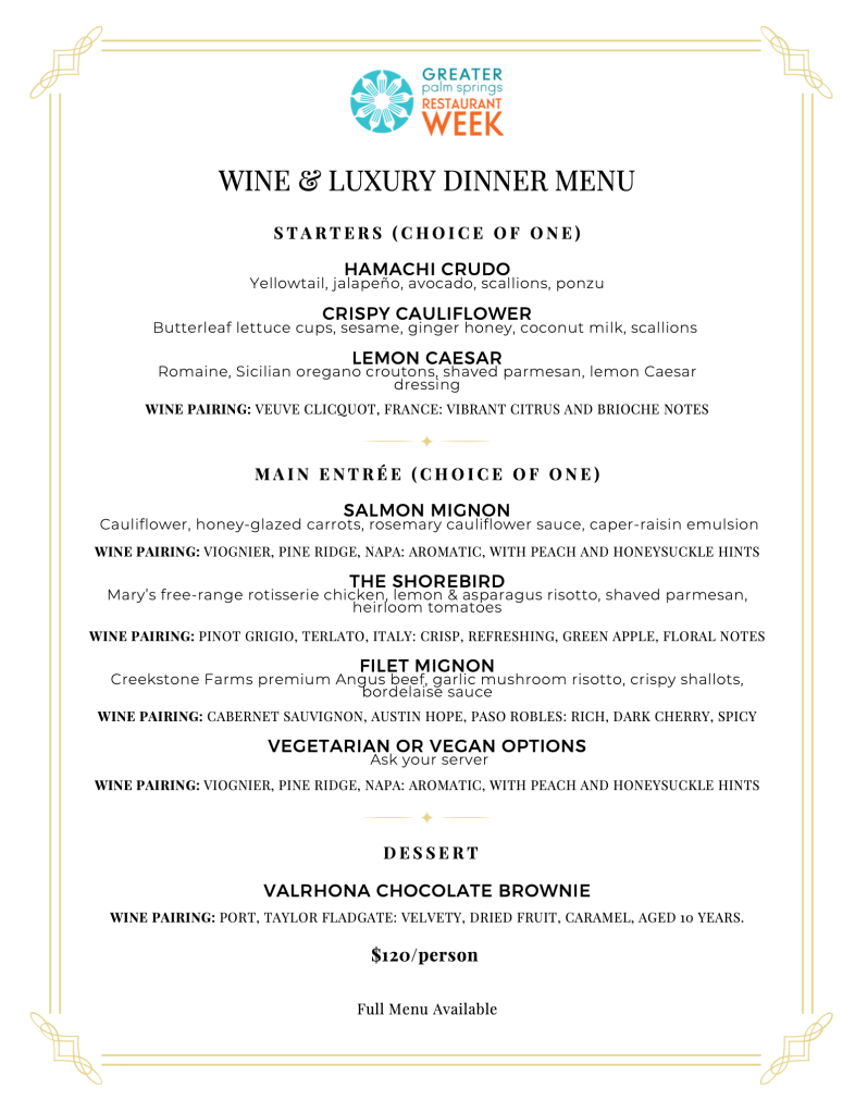 The 2025 Restaurant Week event is made possible with the partnership of all nine cities in the Coachella Valley, Agua Caliente Casinos, and the Agua Caliente Band of Cahuilla Indians – whose ongoing support enriches the region’s culinary tradition.