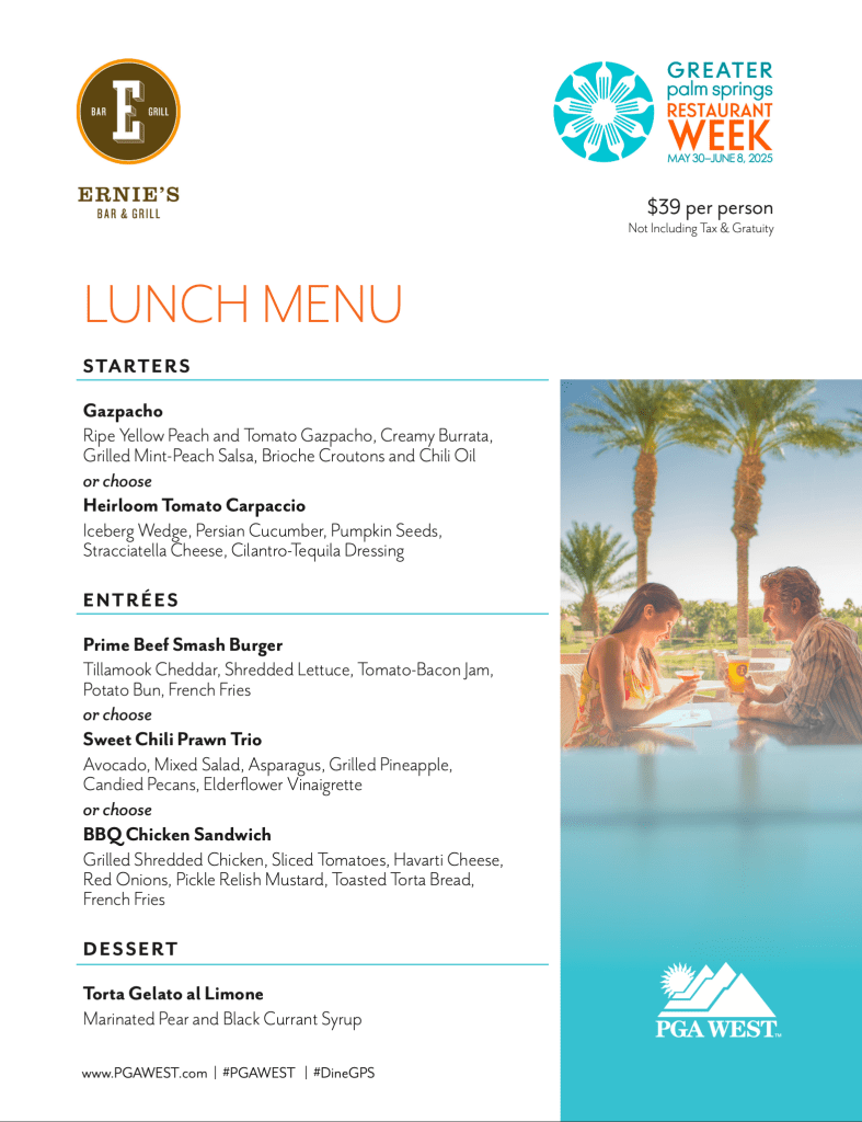 Celebrate culinary excellence at PGA West, the Western Home of Golf in America (including Pete Dye Stadium and Nicklaus Tournament courses). Enjoy lunch at the clubhouse overlooking the golf courses. Take your friend, loved one, or out of town golf fanatic guest for a special multicourse meal offer for lunch and dinner at Ernie’s Bar and Grill.