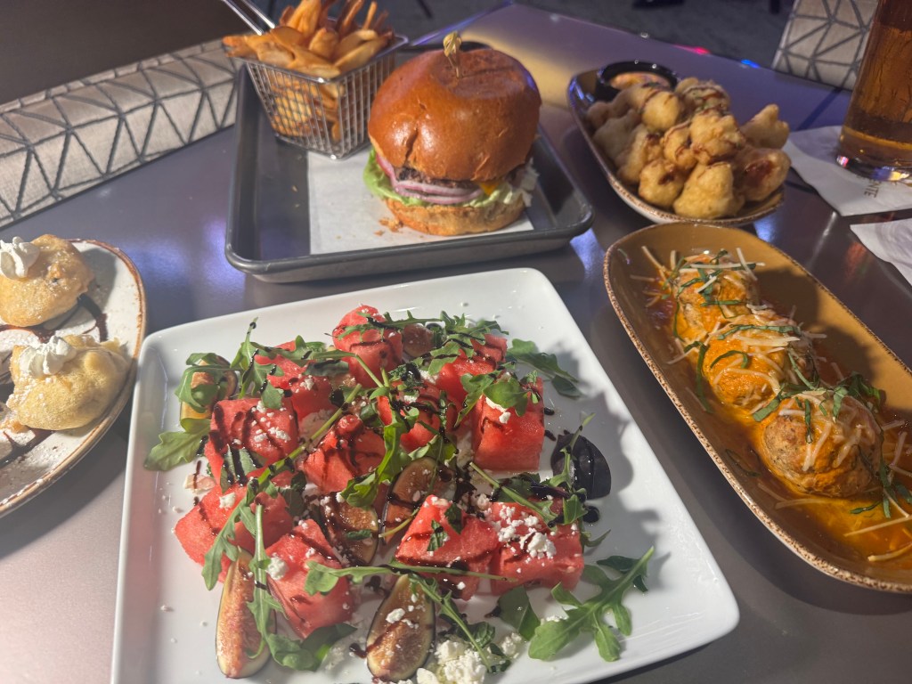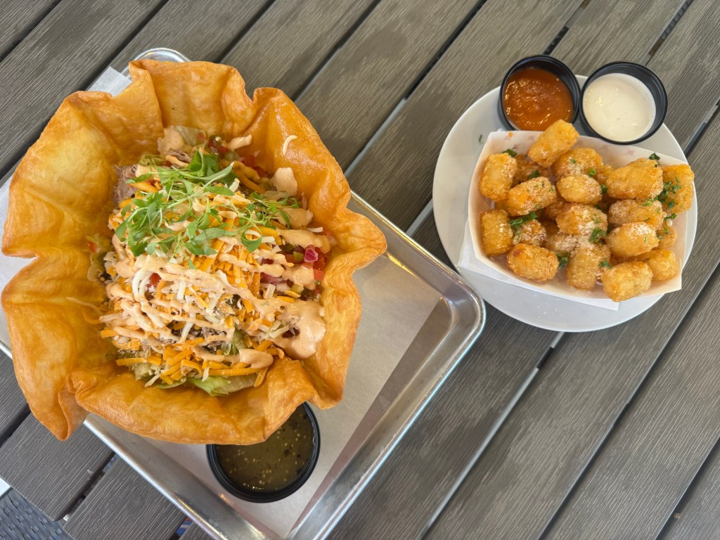 We also love items on the regular menu, like the Big Taco Salad with crispy flour tortilla loaded with carnitas, shrimp, beef, or chicken plus truffle tater tots or deviled eggs with bacon and pickled Jalapeno. Grilled watermelon salad, Baja style tacos, Indio Cubano, La Quinta Cheesesteak, and House Smoked Tri Tip are just some of the amazing crafted options at this casual eatery.