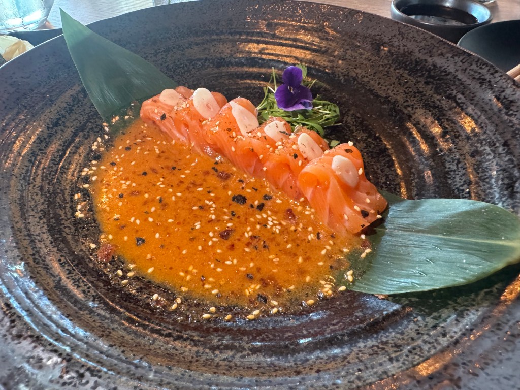 Share the Ikura Nigiri (salmon eggs) and fresh salmon carpaccio set in yuzu dressing with fresh garlic, chili oil, and sesame sauce. Ask about specials like the alluring Toro that arrives smoked under a glass bell adorned with seared uni and gold flecks.