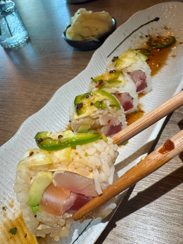 Another go-to favorite menu item is the Millionaire Roll with sushi roll slices rimming a large bowl with yuzu soy dressing and chili oil sauce in the middle meant for dipping. The roll is loaded with shrimp tempura, spicy tuna, and avocado topped with bluefin tuna, yellowtail, and Furikake.