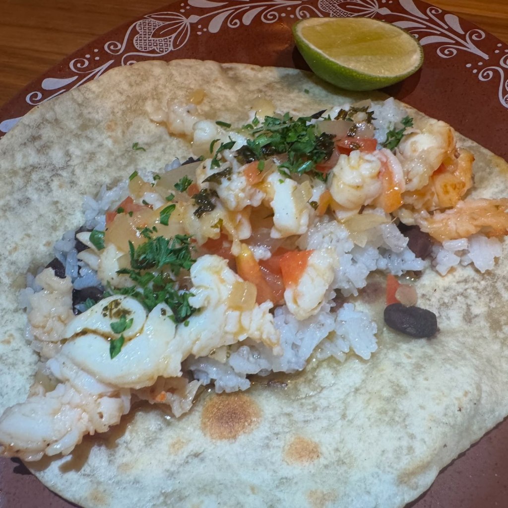 Taco de Langosta (Lobster 🦞 Taco )with butter soaked lobster, black beans, and chipotle mayo in a flour tortilla – a summer special that we hope endures beyond Labor Day.