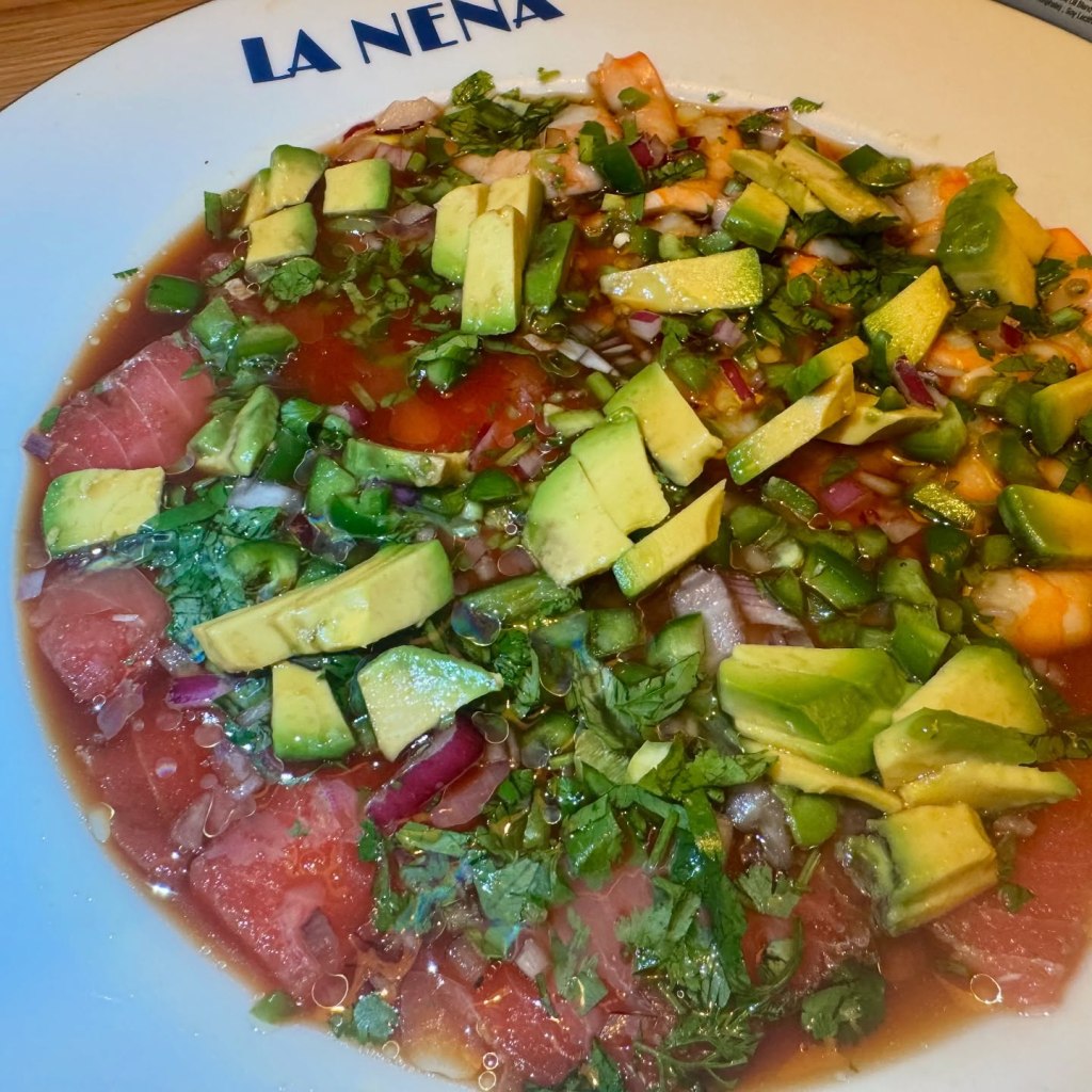 Mixed Carpaccio – so fresh on a grand plate with tuna and shrimp diced avocado and red onion