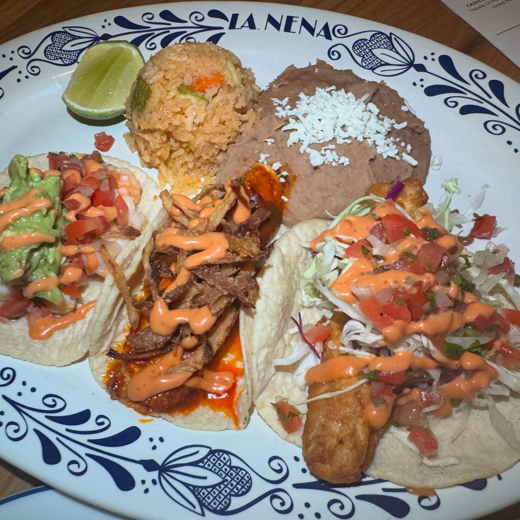 Malibu Tacos Trio 🐟 🍤 featuring Baja-style fish, grilled shrimp, and zarandeado tacos