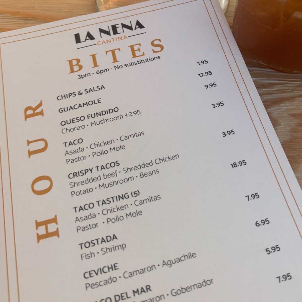 Think $4 tacos, $7 Ceviche Trio, $8 Qusadillas, $10 Nachos (with chicken, beef, or al pastor).