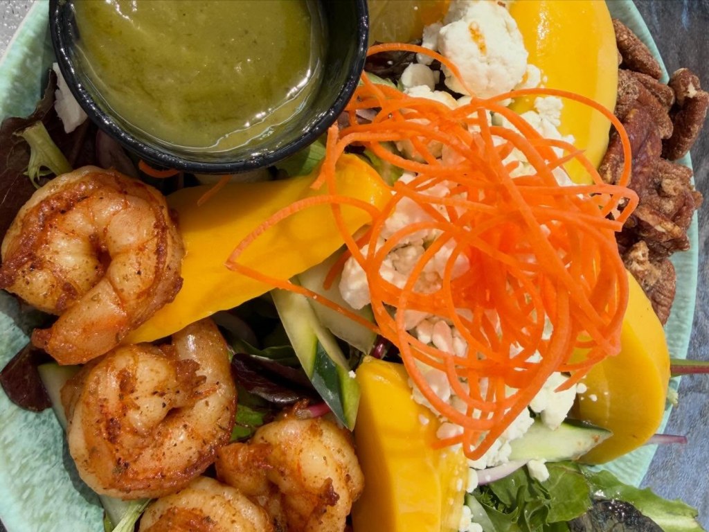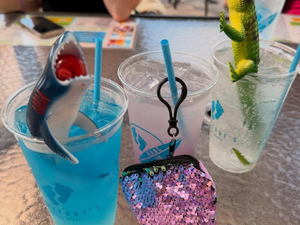At Barefoot’s Beachside Bar and Grill we become kids again, ordering lunch with festive drinks – like The Shark Attack, layered blue-and-green with a toy shark bobbing in the drink, that “dumps” grenadine and Swamp Water, with a floating toy gator that (when flipped upside down) deposits Gatorade green with syrup. The playful sips enhance our casual coastal bites like ahi tuna salad, island chicken sandwiches, and mango goat cheese salad with shrimp.